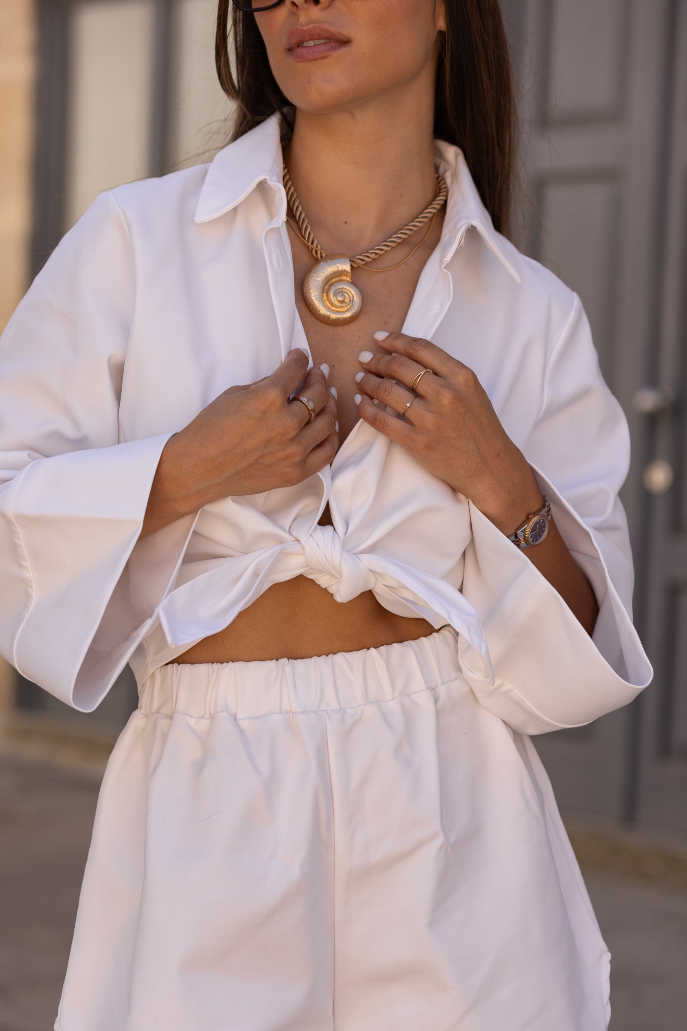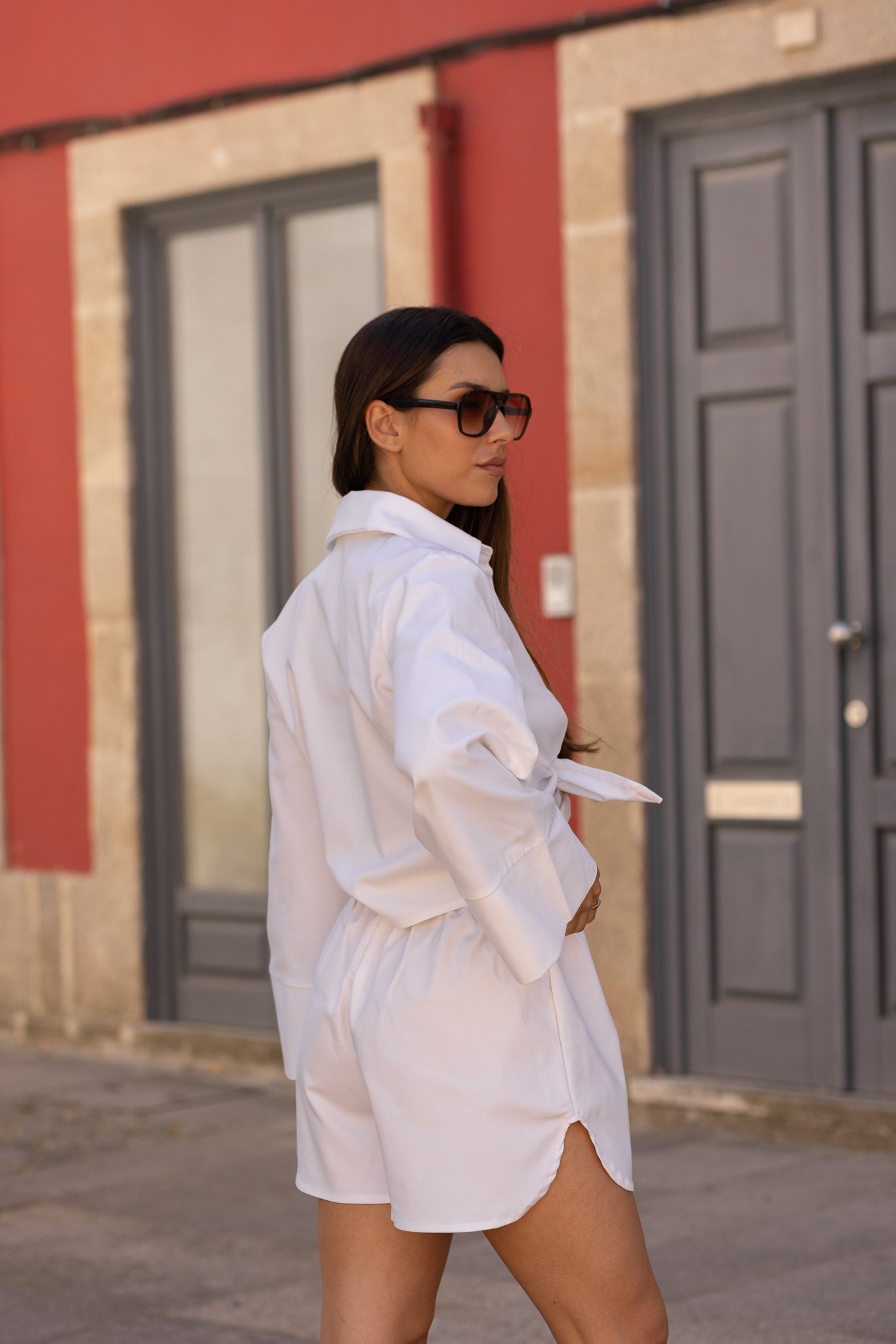 Camisa com mangas largas, conferem-lhe um toque clássico. O seu corte em V torna a camisa versátil, já que pode ser usada amarrada, colocada por dentro dos calções ou simplesmente abotoada até ao fim.