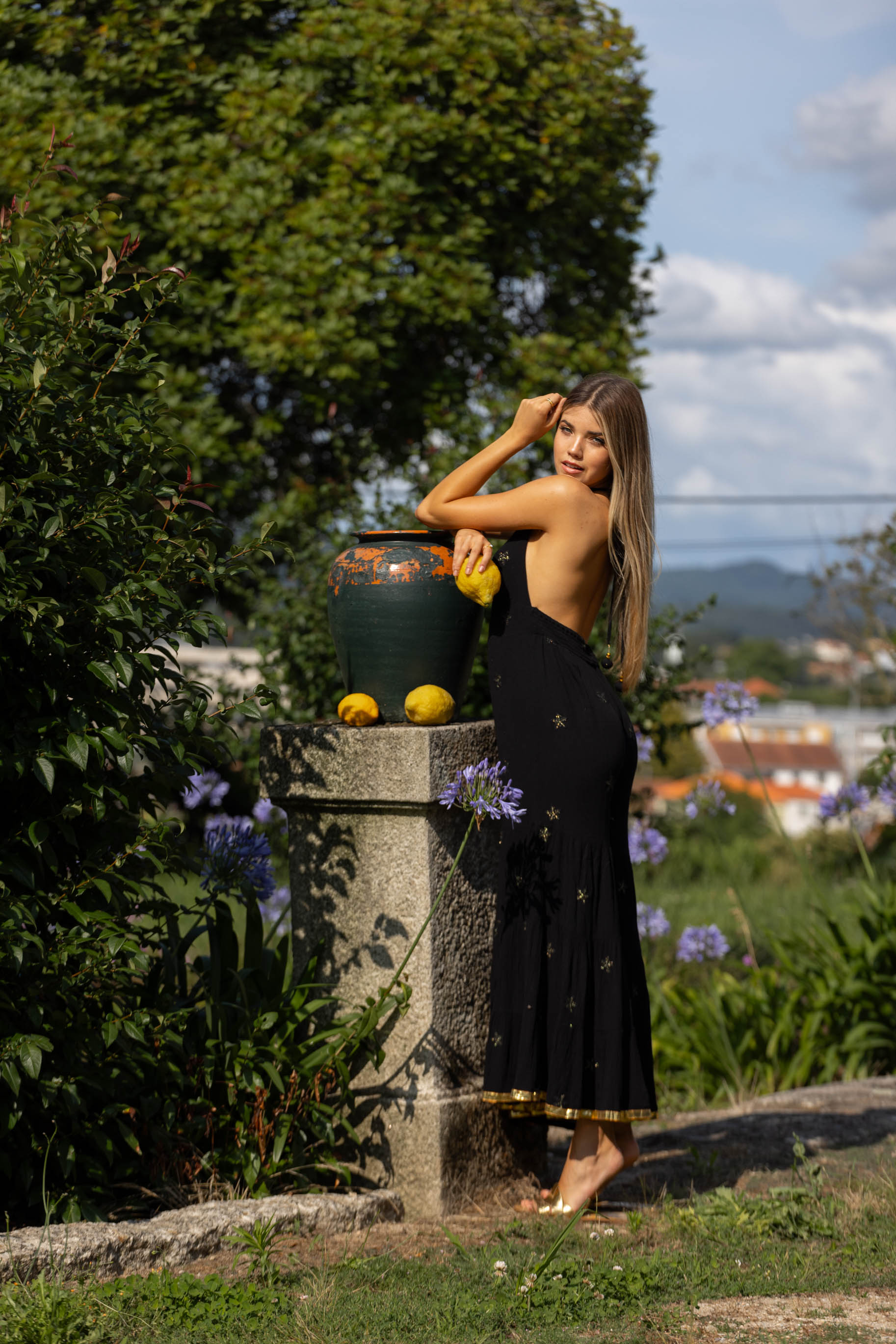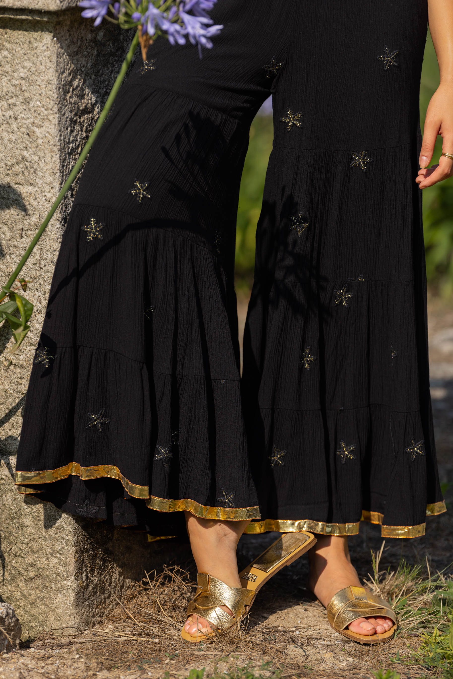 O macacão preto, feito à mão, com detalhes dourados, uma peça sofisticada e elegante que se vai realçar nas tuas ocasiões mais especiais. Os detalhes dourados são o grande destaque dessa peça. Os bordados delicados e discretas miçangas no decote proporcionam um toque de brilho e elegância ao macacão.